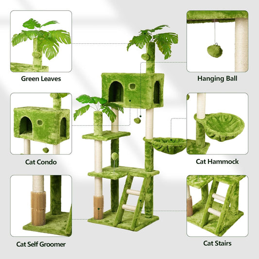 • 65In Tall Cat Tree with Leaves for Indoor Cats, Green Cat Tower with Scratching Post,Hanging Hammock,Cozy Perch,Swing Ball,Self Groomer and Cat Ladder,Cat Tree Tower