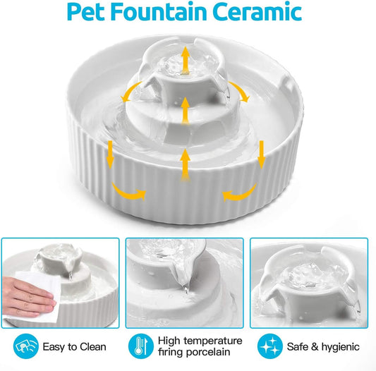 2.1L Ceramic Cat Water Fountain-For Cats and Dogs, 360 Ceramic Pet Fountain-70 Oz Large Water Capacity - Whisper-Quiet Water Flow-Great for Shy or Timid Pets - Fresh, Filtered Water(White)